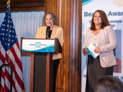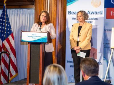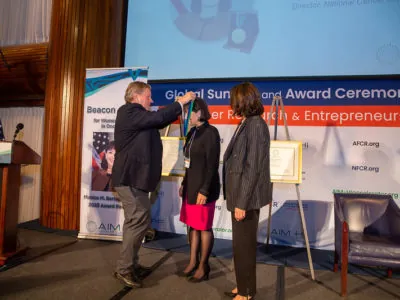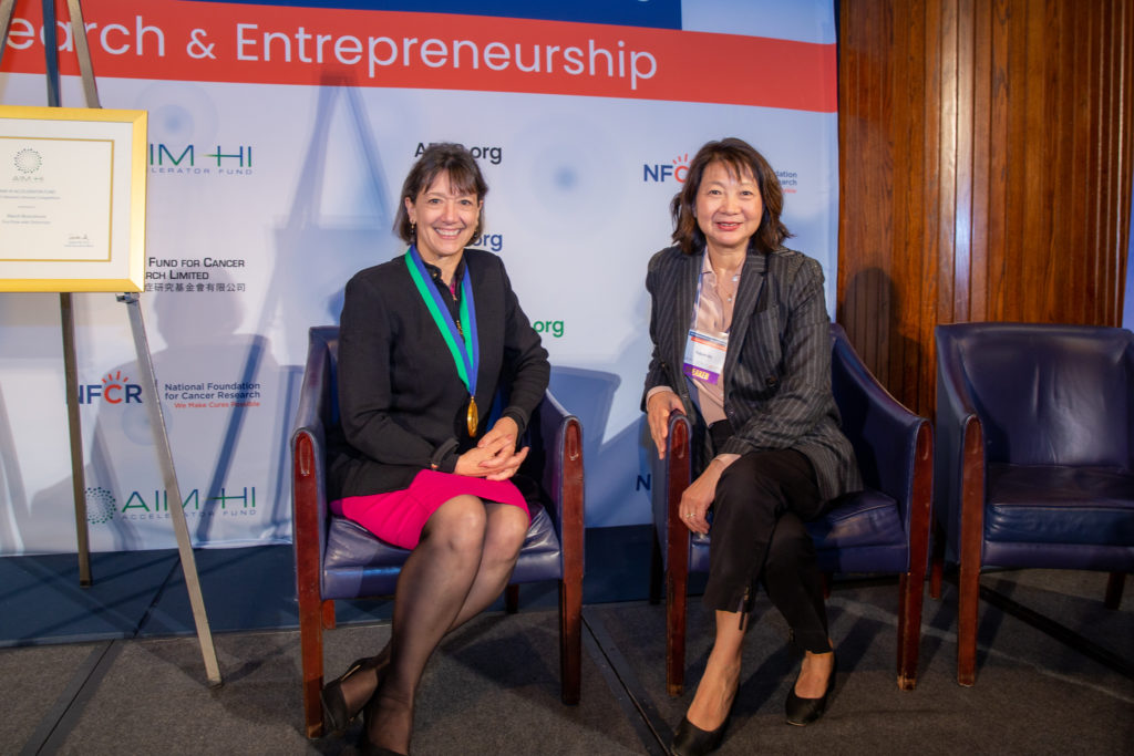 In receiving the Beacon Award for Women Leaders in Oncology, NCI director Monica Bertagnolli, M.D. recognized AIM-HI and NFCR for supporting women’s entrepreneurship in oncology. Dr. Bertagnolli spoke about Project Moonshot and solving the problem of cancer, reiterating the Call for Action she put forward from NCI to reduce cancer’s death rate by 50% by 2047 and make the disease treatable and livable for all those who face it. She outlined three priorities in the common goal to cure cancer. 1) Eliminate inequities and allow for equitable access to screening, diagnosis, and treatments to underrepresented populations. 2) Re-build trust in science and have researchers, scientists, and clinicians engage their communities as ambassadors. 3) Optimize the workforce with diverse, talented teams offering innovative solutions. She emphasized the need to support women scientists with resources and relationships to help match the opportunities with talent. She recognized AIM-HI and NFCR’s efforts in serving this need. Dr. Bertagnolli truly embodies the spirit of what the Beacon Award is all about.