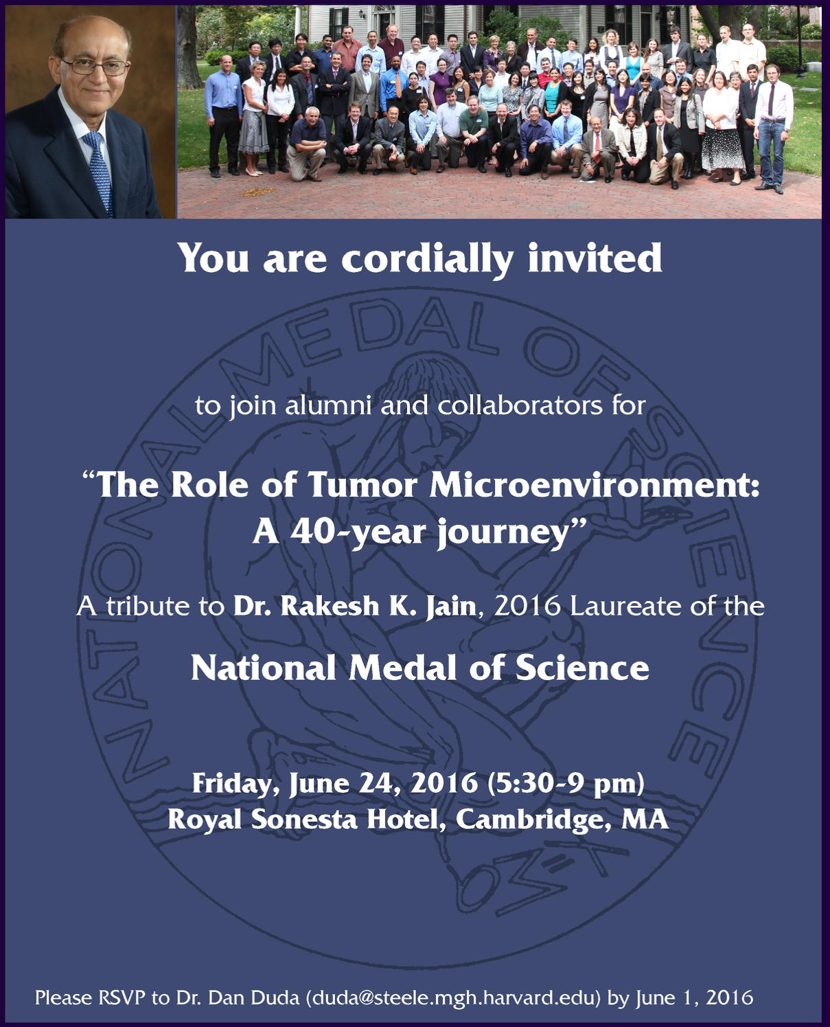 We are so pleased to congratulate National Foundation for Cancer Research funded Scientist Rakesh K. Jain Ph.D. on his tribute event today in Cambridge Massachusetts. A great honor to be feted by his collaborators, peers and fellow scientists and educators at Harvard Medical School and the E.L. Steele Laboratories for Tumor Biology at the Massachusetts General Hospital.. Dr. Jain first received funding from NFCR in Fiscal year 1998. He was a project Director from 1998-2013 and was elevated to NFCR Fellow in 2014.