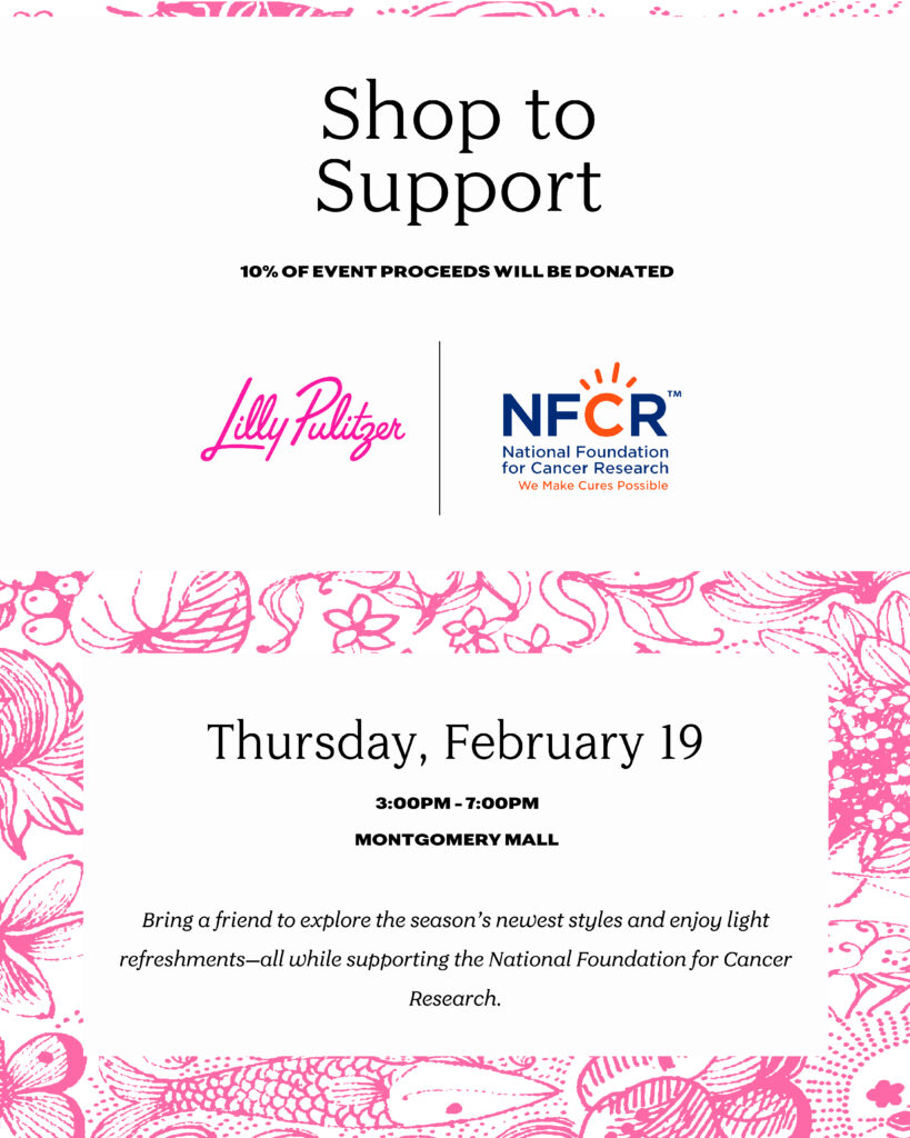 Join us on February 19th, as our designated Shop to Support day at the Lilly Pulitzer location in Montgomery Mall. Come out between 3:00 – 7:00 pm to see the latest collection; 10% of all shopping proceeds will benefit NFCR’s cancer research.