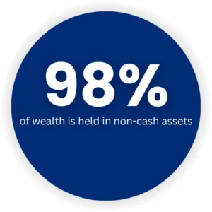 98% of wealth is held in non-cash assets, and those with the highest net worth have a significantly smaller percentage of their wealth stored in cash.