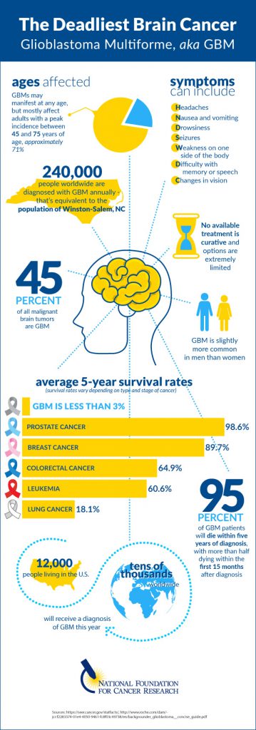 Glioblastoma (GBM) is the deadliest type of brain cancer, accounting for 45% of all malignant brain tumors. In the United States alone, over 12,000 new cases per year are detected. The disease has long been universally fatal and without cure, with a median survival rate after diagnosis of one to two years and killing 95% of patients within five years.